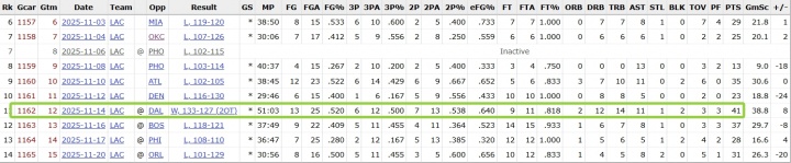11月14日(当地时间),快船双加时击败独行侠,哈登出战51分钟,砍下41分14篮板11助攻1抢断2盖帽。