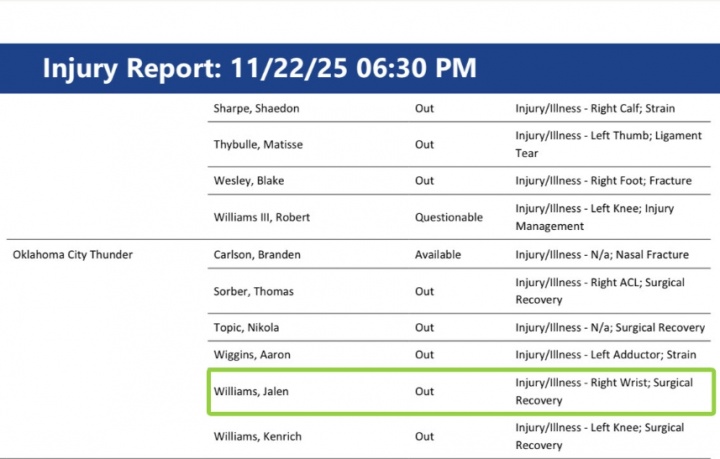 11月23日讯 明日NBA常规赛,雷霆vs开拓者,官方伤病报告显示,杰伦·威廉姆斯因手腕手术恢复伤病缺席。